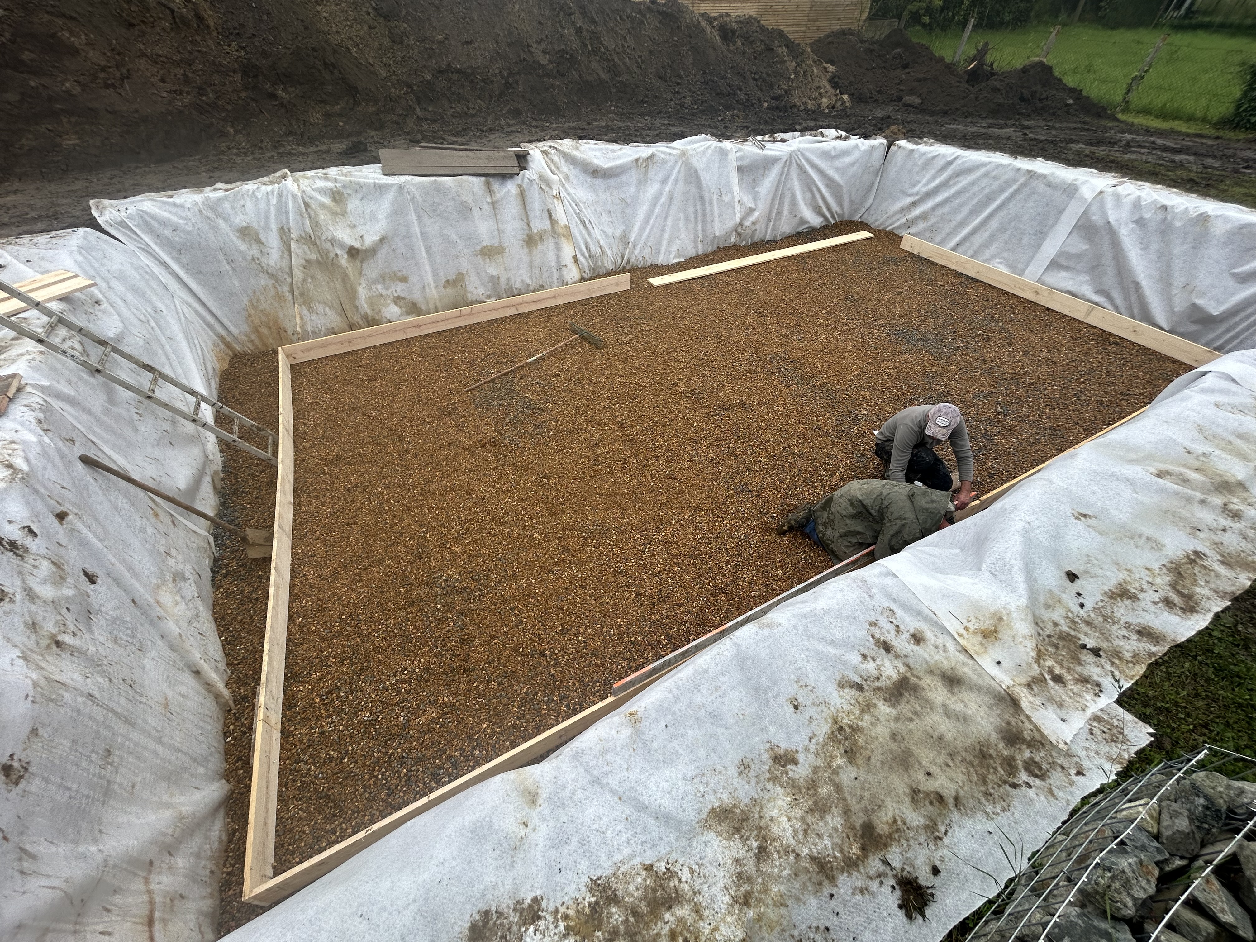Préparation et mise à niveau du fond de forme pour terrasses, garages et zones de stockage, avec pose de géotextile et empierrement drainant.